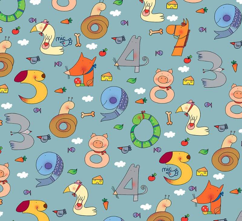 Questo tessuto contiene i disegni di Nicoletta Costa del libro cartonato Primi numeri. Che numero è?