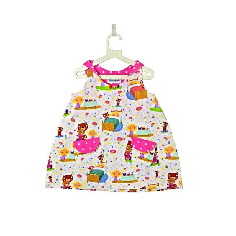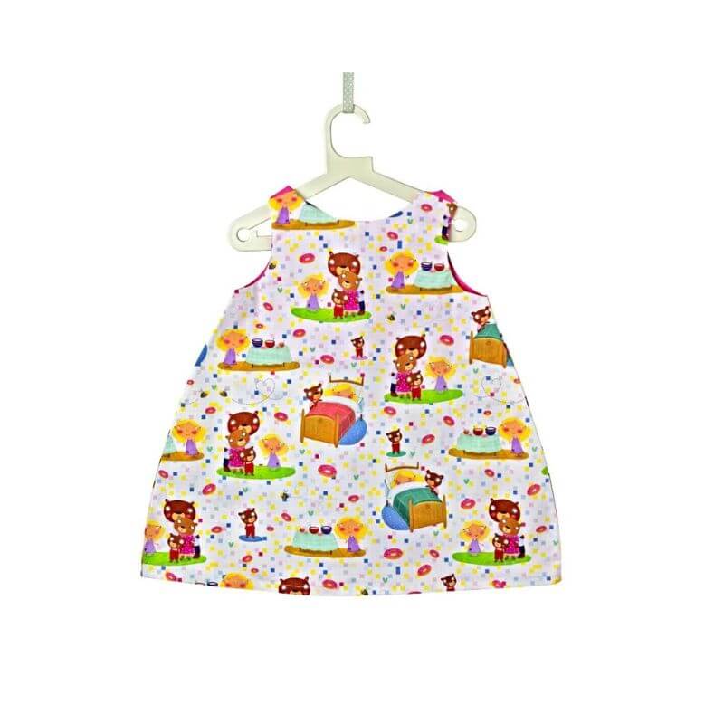 Il tessuto è illustrato da Francesca Assirelli e racconta la favola Riccioli d’oro e i tre orsi