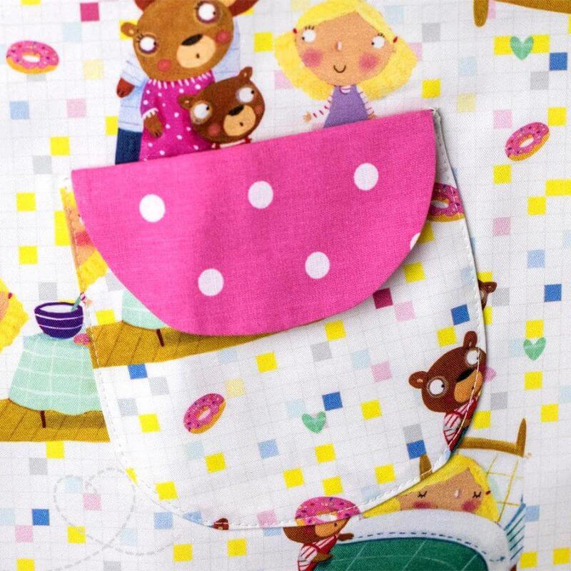 Prendisole con tasche con risvolto a contrasto applicate. Corpetto a contrasto visibile per l’intreccio sulle spalle.